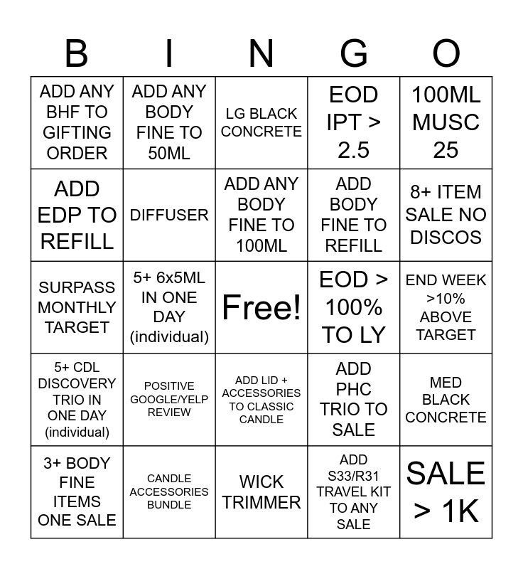 This bingo card has a free space and 40 words: EOD ATV > $200, SURPASS MONTHLY TARGET, LG CONCRETE, DIFFUSER, CANDLE ACCESSORIES BUNDLE, ADD LID + ACCESSORIES TO CLASSIC CANDLE, ADD ANY BODY FINE TO 100ML, ADD ANY INTERIOR CREATION TO 50/100ML EDP, 100ML MUSC 25, 5+ CDL DISCOVERY TRIO IN ONE DAY (individual), 5+ 6x5ML IN ONE DAY (individual), EOD IPT > 2.5, SALE > 1K, END WEEK >10% ABOVE TARGET, EOD > 100% TO LY, POSITIVE GOOGLE/YELP REVIEW, 3+ GROOMING CREATIONS IN ONE SALE, ADD ANY BHF TO GIFTING ORDER, 4+ CANDLES IN ONE SALE, LG BLACK CONCRETE, MED BLACK CONCRETE, ADD S33/R31 TRAVEL KIT TO ANY SALE, ADD BODY FINE TO REFILL, ADD EDP TO REFILL, ADD CONCRETE VOTIVES TO ANY SALE, DS17 + 50/100ml, GIFT WRAP KRAFT BOX, ANY BOOK, ANY TOTE, TRV TUBE W/CASE, SELL 1 PKG FROM GIFTING GUIDE, 3+ BODY FINE ITEMS ONE SALE, 4+ BHF ITEMS ONE SALE, ADD PHC TRIO TO SALE, 8+ ITEM SALE NO DISCOS, WICK TRIMMER, CANDLE SNUFFER, 2+ EDP 50/100ml ONE SALE, ADD ANY BODY FINE TO 50ML and ADD HOME FRAG. TO ANY SALE.