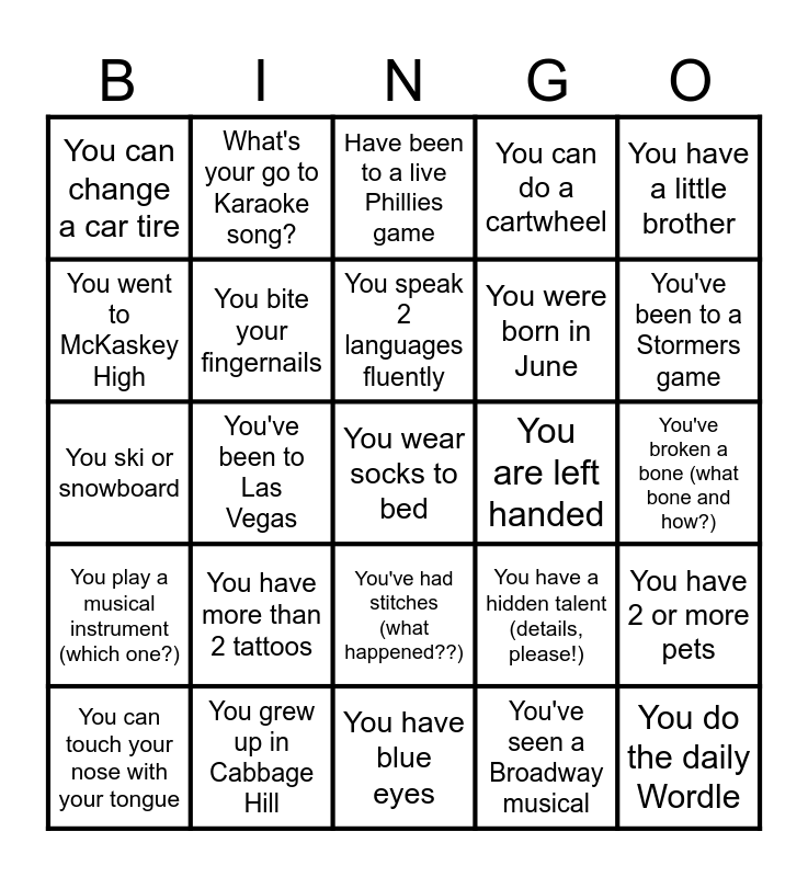 This bingo card has 25 words: You have more than 2 tattoos, You have blue eyes, You speak 2 languages fluently, You can touch your nose with your tongue, You have a little brother, You can change a car tire, You went to McKaskey High, What's your go to Karaoke song?, You are left handed, You've had stitches (what happened??), You were born in June, You ski or snowboard, You have a hidden talent (details, please!), You have 2 or more pets, You bite your fingernails, You do the daily Wordle, You've broken a bone (what bone and how?), Have been to a live Phillies game, You've been to a Stormers game, You've been to Las Vegas, You wear socks to bed, You grew up in Cabbage Hill, You play a musical instrument (which one?), You can do a cartwheel and You've seen a Broadway musical.