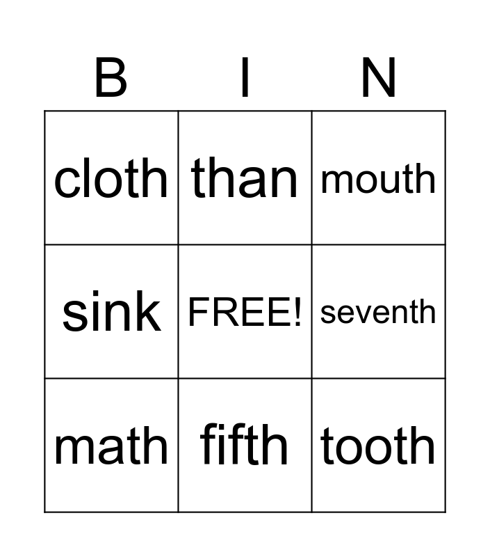 This bingo card has a free space and 40 words: tanks, thin, with, math, thick, think, fifth, fourth, tooth, there, teeth, sink, third, thanks, thief, thing, breeze, cloth, dad, mouth, thirty, three, sixth, seventh, thanks, tanks, there, dare, that, dad, breeze, breathe, tree, three, math, teeth, sink, think, than and Dan.