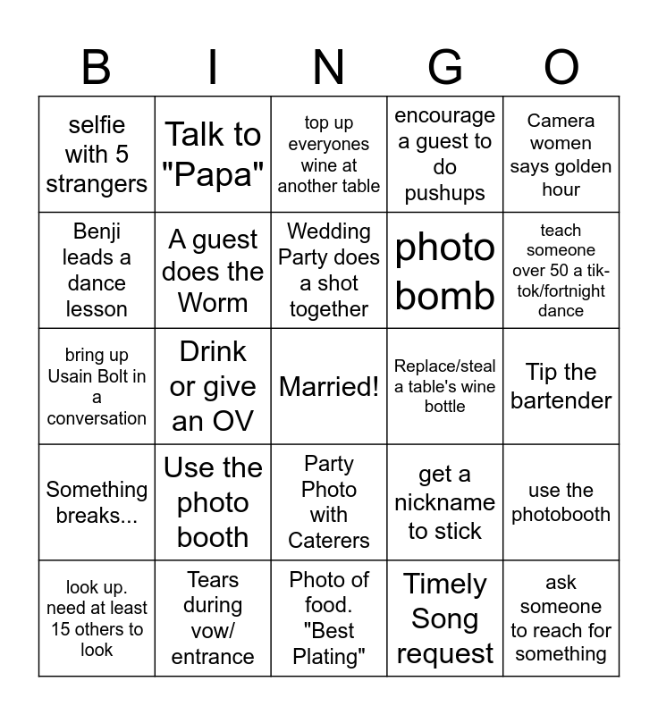 This bingo card has a free space and 59 words: Tears during speech, Tears during vow/ entrance, Bride or Groom Trip, Something breaks..., Timely Song request, Deliver a drink or water to the couple, A guest does the Worm, Abi does a back flip, photo bomb, guest arm wrestle match, encourage a guest to do pushups, complete the sip and solve, Benji leads a dance lesson, unsolicited marriage advice not to the couple, bar limit reached!, selfie with 5 strangers, ask someone to reach for something, Camera women says golden hour, DJ cuts off a song at "the good part", Wedding Party does a shot together, Replace/steal a table's wine bottle, top up everyones wine at another table, look up. need at least 15 others to look, use the photobooth, use the QR code, race someone while giving a piggy back, A speech got awkward, double-toast, teach someone over 50 a tik-tok/fortnight dance, second plate of food, saulte a grooman for time-served, bow to a bridesmaid as thank you/ greeting, groom was lifted up, Talk to "Beppe", Talk to "Papa", Talk to Ainsley (father of Bride), High Five Moment, Drink or give an OV, learn a Jamaican Phrase, bring up Usain Bolt in a conversation, duck, duck, Goose, Use the photo booth, Tip the bartender, 5 youngest for a photo (add to QR), 5 oldest for a photo (add to QR), Photo with Camera girl (Cassie), Party Photo with bartenders, Party Photo with DJ, Party Photo with Caterers, Photo of food. "Best Plating", Photo with Bride and Groom, Win a game, Find guest that can do a handstand 20s, Make/ win a bet, leave a voice message, get a nickname to stick, find someone with the same job, do a magic trick and tell a good old days story.