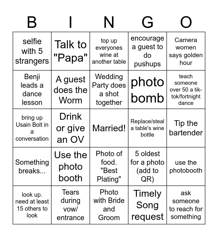 This bingo card has a free space and 61 words: Tears during speech, Tears during vow/ entrance, Bride or Groom Trip, Something breaks..., Timely Song request, Deliver a drink or water to the couple, A guest does the Worm, Abi does a back flip, photo bomb, guest arm wrestle match, encourage a guest to do pushups, complete the sip and solve, Benji leads a dance lesson, unsolicited marriage advice not to the couple, bar limit reached!, selfie with 5 strangers, ask someone to reach for something, Camera women says golden hour, DJ cuts off a song at "the good part", Wedding Party does a shot together, Replace/steal a table's wine bottle, top up everyones wine at another table, look up. need at least 15 others to look, use the photobooth, use the QR code, race someone while giving a piggy back, A speech got awkward, double-toast, teach someone over 50 a tik-tok/fortnight dance, second plate of food, saulte a grooman for time-served, bow to a bridesmaid as thank you/ greeting, groom was lifted up, Talk to "Beppe", Talk to "Papa", Talk to Ainsley (father of Bride), High Five Moment, Drink or give an OV, learn a Jamaican Phrase, bring up Usain Bolt in a conversation, duck, duck, Goose, Use the photo booth, Tip the bartender, 5 youngest for a photo (add to QR), 5 oldest for a photo (add to QR), Photo with Camera girl (Cassie), Party Photo with bartenders, Party Photo with DJ, Party Photo with Caterers, Photo of food. "Best Plating", Photo with Bride and Groom, Win a game, Find guest that can do a handstand 20s, Make/ win a bet, leave a voice message, get a nickname to stick, find someone with the same job, do a magic trick, tell a good old days story, Compliment the Moms and Congratulate Aleah for being Aleah.