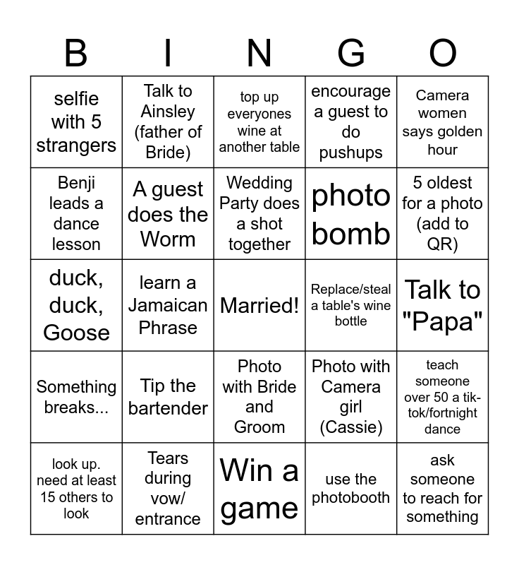 This bingo card has a free space and 62 words: Tears during speech, Tears during vow/ entrance, Bride or Groom Trip, Something breaks..., Timely Song request, Deliver a drink or water to the couple, A guest does the Worm, Abi does a back flip, photo bomb, guest arm wrestle match, encourage a guest to do pushups, complete the sip and solve, Benji leads a dance lesson, unsolicited marriage advice not to the couple, bar limit reached!, selfie with 5 strangers, ask someone to reach for something, Camera women says golden hour, DJ cuts off a song at "the good part", Wedding Party does a shot together, Replace/steal a table's wine bottle, top up everyones wine at another table, look up. need at least 15 others to look, use the photobooth, use the QR code, race someone while giving a piggy back, A speech got awkward, double-toast, teach someone over 50 a tik-tok/fortnight dance, second plate of food, saulte a grooman for time-served, bow to a bridesmaid as thank you/ greeting, groom was lifted up, Talk to "Beppe", Talk to "Papa", Talk to Ainsley (father of Bride), High Five Moment, Drink or give an OV, learn a Jamaican Phrase, bring up Usain Bolt in a conversation, duck, duck, Goose, Use the photo booth, Tip the bartender, 5 youngest for a photo (add to QR), 5 oldest for a photo (add to QR), Photo with Camera girl (Cassie), Party Photo with bartenders, Party Photo with DJ, Party Photo with Caterers, Photo of food. "Best Plating", Photo with Bride and Groom, Win a game, Find guest that can do a handstand 20s, Make/ win a bet, leave a voice message, get a nickname to stick, find someone with the same job, do a magic trick, tell a good old days story, Compliment the Moms, Congratulate Aleah for being Aleah and sweat towel.