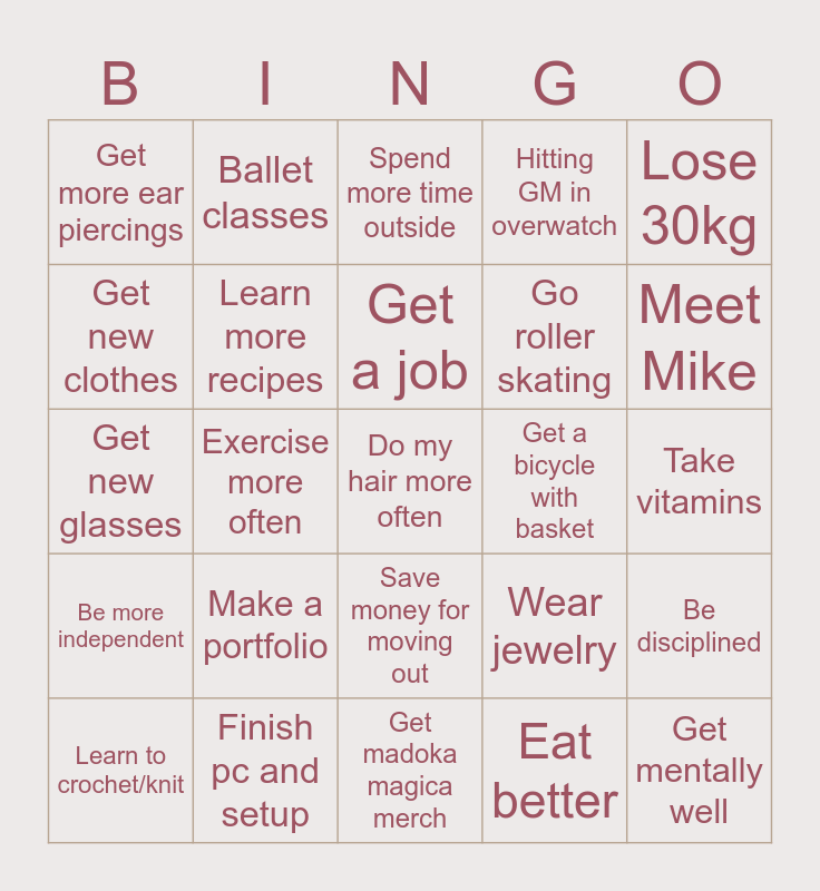 This bingo card has a free space and 24 words: Make a portfolio, Finish pc and setup, Get a job, Learn to crochet/knit, Lose 30kg, Get more ear piercings, Get new clothes, Ballet classes, Get a bicycle with basket, Save money for moving out, Go roller skating, Get new glasses, Wear jewelry, Be disciplined, Learn more recipes, Eat better, Take vitamins, Spend more time outside, Meet Mike, Exercise more often, Get mentally well, Be more independent, Hitting GM in overwatch and Get madoka magica merch.