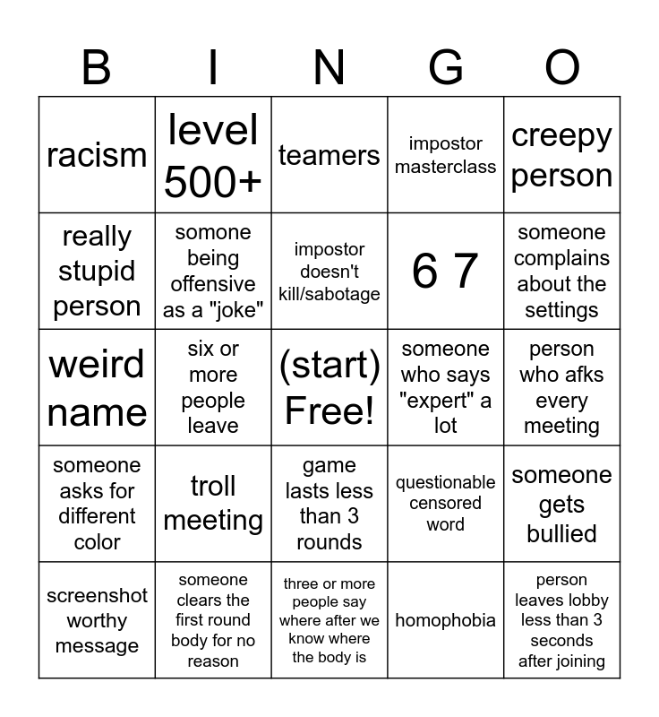 This bingo card has a free space and 24 words: troll meeting, someone clears the first round body for no reason, impostor doesn't kill/sabotage, screenshot worthy message, creepy person, racism, really stupid person, level 500+, someone who says "expert" a lot, game lasts less than 3 rounds, 6 7, weird name, questionable censored word, someone gets bullied, somone being offensive as a "joke", homophobia, person who afks every meeting, teamers, someone complains about the settings, six or more people leave, person leaves lobby less than 3 seconds after joining, someone asks for different color, impostor masterclass and three or more people say where after we know where the body is.
