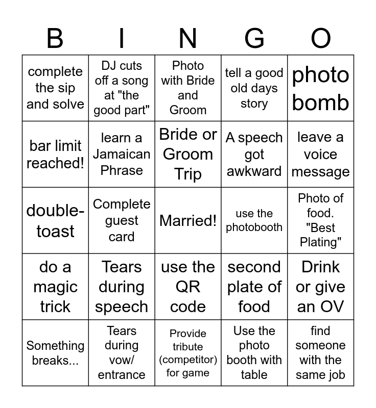 This bingo card has a free space and 24 words: Tears during speech, Tears during vow/ entrance, Bride or Groom Trip, Something breaks..., photo bomb, complete the sip and solve, bar limit reached!, DJ cuts off a song at "the good part", use the photobooth, use the QR code, A speech got awkward, double-toast, second plate of food, Drink or give an OV, learn a Jamaican Phrase, Use the photo booth with table, Photo of food. "Best Plating", Photo with Bride and Groom, leave a voice message, Complete guest card, find someone with the same job, do a magic trick, tell a good old days story and Provide tribute (competitor) for game.