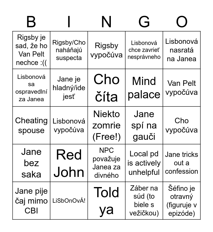 This bingo card has a free space and 24 words: Red John, LiSbOnOvÁ!, Cho číta, Jane pije čaj mimo CBI, Lisbonová nasratá na Janea, Rigsby je sad, že ho Van Pelt nechce :((, Lisbonová sa ospravedlní za Janea, Rigsby/Cho naháňajú suspecta, Jane spí na gauči, NPC považuje Janea za divného, Mind palace, Cheating spouse, Local pd is actively unhelpful, Jane tricks out a confession, Jane je hladný/ide jesť, Záber na súd (to biele s vežičkou), Cho vypočúva, Rigsby vypočúva, Van Pelt vypočúva, Lisbonová vypočúva, Šéfino je otravný (figuruje v epizóde), Jane bez saka, Lisbonová chce zavrieť nesprávneho and Told ya.