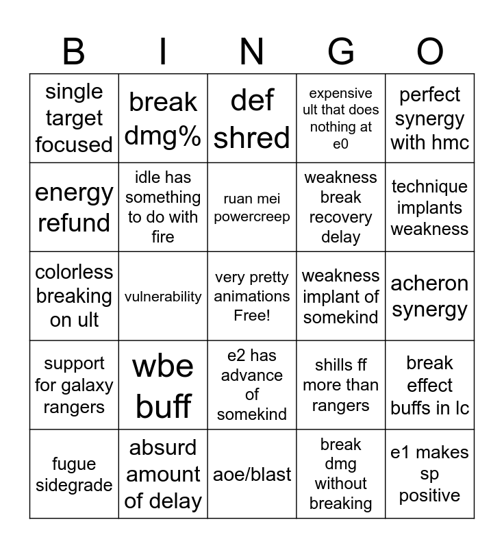 This bingo card has a free space and 24 words: wbe buff, absurd amount of delay, ruan mei powercreep, fugue sidegrade, perfect synergy with hmc, single target focused, energy refund, break dmg%, weakness implant of somekind, e2 has advance of somekind, weakness break recovery delay, colorless breaking on ult, shills ff more than rangers, break effect buffs in lc, idle has something to do with fire, break dmg without breaking, acheron synergy, def shred, technique implants weakness, vulnerability, e1 makes sp positive, support for galaxy rangers, expensive ult that does nothing at e0 and aoe/blast.