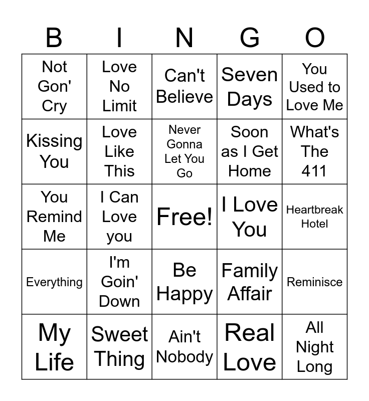 This bingo card has a free space and 24 words: I'm Goin' Down, Sweet Thing, Never Gonna Let You Go, My Life, You Used to Love Me, Not Gon' Cry, Kissing You, Love No Limit, I Love You, Be Happy, Soon as I Get Home, You Remind Me, Family Affair, Reminisce, Love Like This, Real Love, Heartbreak Hotel, Can't Believe, What's The 411, I Can Love you, All Night Long, Everything, Seven Days and Ain't Nobody.