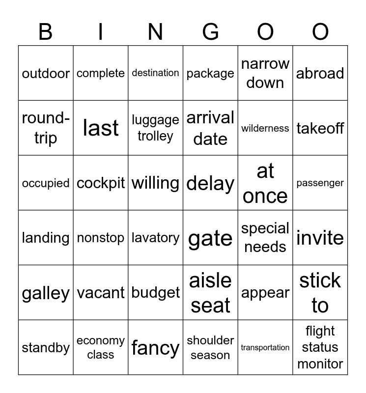 This bingo card has 78 words: package price, contact details, destination, price range, itinerary, length of stay, transportation, getaway, shoulder season, have...in mind, budget, altogether, package, outdoor, consider, abroad, stick to, at once, spending money, willing, fancy, narrow down, wilderness, last, round-trip, accommodation, go for, document, fare, taxes, arrival date, restrictions, special needs, galley, lavatory, cockpit, first class, business class, economy class, occupied, vacant, depart, one-way, return, standby, complete, aisle seat, appear, upgrade row, confirm, nonstop, takeoff, landing, leg, note, airsick, flight status monitor, baggage, carry-on, passenger, luggage trolley, boarding pass, passport, check-in counter, scale, luggage tag, running late, hand, delay, gate, liquid, gel, seal, metal detector, invite, spare, line up and get bridge.