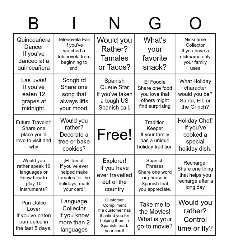 This bingo card has a free space and 24 words: ¡El Tamal! If you’ve ever helped make tamales for the holidays, mark your card!, Language Collector If you know more than 2 languages, Spanish Queue Star If you've taken a tough US Spanish call., Pan Dulce Lover If you've eaten pan dulce in the last 5 days., Nickname Collector If you have a nickname only your family uses, Quinceañera Dancer If you've danced at a quinceañera, Las uvas! If you've eaten 12 grapes at midnight., Telenovela Fan If you've watched a telenovela from beginning to end., Tradition Keeper If your family has a unique holiday tradition, Explorer! If you have ever travelled out of the country, El Foodie Share one food you love that others might find surprising, Future Traveler! Share one place you'd love to visit and why, Spanish Phrases Share one word or phrase in Spanish that you appreciate., Recharger Share one thing that helps you recharge after a long day, Songbird Share one song that always lifts your mood., Take me to the Movies! What is your go-to movie?, Holiday Chef! If you've cooked a special holiday dish., Would you Rather? Tamales or Tacos?, What Holiday character would you be? Santa, Elf, or the Grinch?, Would you rather? Decorate a tree or bake cookies?, Would you rather? Control time or fly?, Would you rather speak 10 languages or know how to play 10 instruments?, What's your favorite snack? and Customer Compliment If a customer has thanked you for helping them in Spanish, mark your card!.