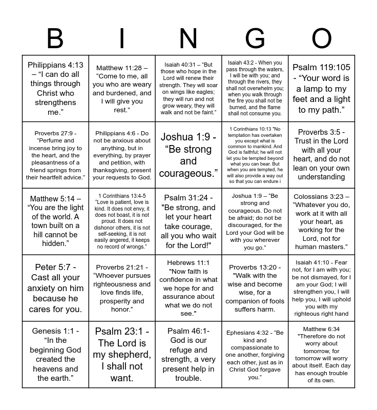 This bingo card has a free space and 24 words: Genesis 1:1 - “In the beginning God created the heavens and the earth.”, Proverbs 21:21 - “Whoever pursues righteousness and love finds life, prosperity and honor.”, Joshua 1:9 - “Be strong and courageous.”, Ephesians 4:32 - “Be kind and compassionate to one another, forgiving each other, just as in Christ God forgave you.”, Psalm 119:105 - “Your word is a lamp to my feet and a light to my path.”, Philippians 4:13 – “I can do all things through Christ who strengthens me.”, Matthew 11:28 – “Come to me, all you who are weary and burdened, and I will give you rest.”, Isaiah 40:31 – “But those who hope in the Lord will renew their strength. They will soar on wings like eagles; they will run and not grow weary, they will walk and not be faint.”, Joshua 1:9 – “Be strong and courageous. Do not be afraid; do not be discouraged, for the Lord your God will be with you wherever you go.”, Colossians 3:23 – “Whatever you do, work at it with all your heart, as working for the Lord, not for human masters.”, Matthew 5:14 – “You are the light of the world. A town built on a hill cannot be hidden.”, Philippians 4:6 - Do not be anxious about anything, but in everything, by prayer and petition, with thanksgiving, present your requests to God., Proverbs 13:20 - "Walk with the wise and become wise, for a companion of fools suffers harm., Isaiah 41:10 - Fear not, for I am with you; be not dismayed, for I am your God; I will strengthen you, I will help you, I will uphold you with my righteous right hand, Proverbs 27:9 - “Perfume and incense bring joy to the heart, and the pleasantness of a friend springs from their heartfelt advice.”, Psalm 23:1 - The Lord is my shepherd, I shall not want., Psalm 46:1- God is our refuge and strength, a very present help in trouble., Isaiah 43:2 - When you pass through the waters, I will be with you; and through the rivers, they shall not overwhelm you; when you walk through the fire you shall not be burned, and the flame shall not consume you., Proverbs 3:5 - Trust in the Lord with all your heart, and do not lean on your own understanding, Peter 5:7 - Cast all your anxiety on him because he cares for you., 1 Corinthians 13:4-5 “Love is patient, love is kind. It does not envy, it does not boast, it is not proud. It does not dishonor others, it is not self-seeking, it is not easily angered, it keeps no record of wrongs.”, Hebrews 11:1 "Now faith is confidence in what we hope for and assurance about what we do not see.", 1 Corinthians 10:13 "No temptation has overtaken you except what is common to mankind. And God is faithful; he will not let you be tempted beyond what you can bear. But when you are tempted, he will also provide a way out so that you can endure i and Matthew 6:34 "Therefore do not worry about tomorrow, for tomorrow will worry about itself. Each day has enough trouble of its own..