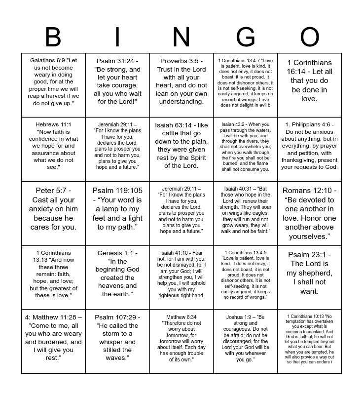 This bingo card has a free space and 24 words: Genesis 1:1 - “In the beginning God created the heavens and the earth.”, Psalm 107:29 - “He called the storm to a whisper and stilled the waves.”, Isaiah 63:14 - like cattle that go down to the plain, they were given rest by the Spirit of the Lord., 4: Matthew 11:28 – “Come to me, all you who are weary and burdened, and I will give you rest.”, 1 Corinthians 16:14 - Let all that you do be done in love., Galatians 6:9 "Let us not become weary in doing good, for at the proper time we will reap a harvest if we do not give up.", Hebrews 11:1 "Now faith is confidence in what we hope for and assurance about what we do not see.", Psalm 31:24 - "Be strong, and let your heart take courage, all you who wait for the Lord!", Isaiah 40:31 – “But those who hope in the Lord will renew their strength. They will soar on wings like eagles; they will run and not grow weary, they will walk and not be faint.”, Isaiah 41:10 - Fear not, for I am with you; be not dismayed, for I am your God; I will strengthen you, I will help you, I will uphold you with my righteous right hand., Isaiah 43:2 - When you pass through the waters, I will be with you; and through the rivers, they shall not overwhelm you; when you walk through the fire you shall not be burned, and the flame shall not consume you., Peter 5:7 - Cast all your anxiety on him because he cares for you., 1 Corinthians 13:4-5 “Love is patient, love is kind. It does not envy, it does not boast, it is not proud. It does not dishonor others, it is not self-seeking, it is not easily angered, it keeps no record of wrongs.”, Psalm 23:1 - The Lord is my shepherd, I shall not want., Jeremiah 29:11 – “For I know the plans I have for you, declares the Lord, plans to prosper you and not to harm you, plans to give you hope and a future.”, Joshua 1:9 – “Be strong and courageous. Do not be afraid; do not be discouraged, for the Lord your God will be with you wherever you go.”, Romans 12:10 - “Be devoted to one another in love. Honor one another above yourselves.”, Proverbs 3:5 - Trust in the Lord with all your heart, and do not lean on your own understanding., 1. Philippians 4:6 - Do not be anxious about anything, but in everything, by prayer and petition, with thanksgiving, present your requests to God., Psalm 119:105 - “Your word is a lamp to my feet and a light to my path.”, 1 Corinthians 10:13 "No temptation has overtaken you except what is common to mankind. And God is faithful; he will not let you be tempted beyond what you can bear. But when you are tempted, he will also provide a way out so that you can endure i, 1 Corinthians 13:13 "And now these three remain: faith, hope, and love; but the greatest of these is love.", 1 Corinthians 13:4-7 "Love is patient, love is kind. It does not envy, it does not boast, it is not proud. It does not dishonor others, it is not self-seeking, it is not easily angered, it keeps no record of wrongs. Love does not delight in evil b and Matthew 6:34 "Therefore do not worry about tomorrow, for tomorrow will worry about itself. Each day has enough trouble of its own.".
