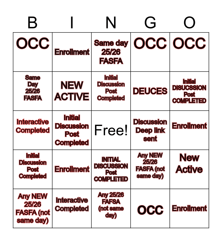 This bingo card has a free space and 24 words: Enrollment, Interactive Completed, Initial Discussion Post Completed, Any NEW 25/26 FASFA (not same day), OCC, OCC, Same Day 25/26 FASFA, Enrollment, Discussion Deep link sent, INITIAL DISCUSSION Post COMPLETED, DEUCES, Interactive Completed, Any NEW 25/26 FASFA (not same day), New Active, NEW ACTIVE, occ, Enrollment, Same day 25/26 FASFA, Initial DISUCSSION Post COMPLETED, Initial Discussion Post Completed, Enrollment, Initial Discussion Post Completed, OCC and Any 25/26 FAFSA (not same day).