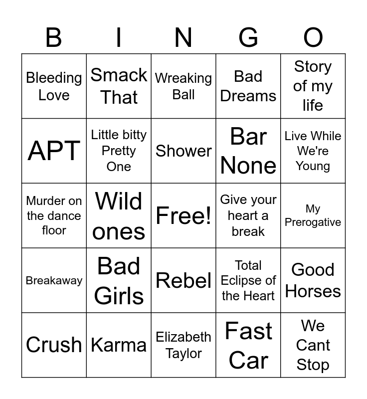 This bingo card has a free space and 60 words: Good Graces, Karma, Wait a Minute, Breakaway, Fast Car, Good Luck Babe, Little bitty Pretty One, Devil in a Dress, Bar None, Daisies, Bad Dreams, Abracadabra, APT, Why Don't you Love Me, Who Knew, Bleeding Love, We Cant Stop, Story of my life, You belong with me, Shower, Give your heart a break, Wreaking Ball, Crush, Good Horses, You look like you love me, Clumsy, Love on Top, Not Over you, Live While We're Young, Drive By, Stronger, Somebody that I used to know, Break Free, Best Song Ever, Smack That, Kiss Kiss, Rolling in the Deep, Wild ones, Notorious, Murder on the dance floor, A bay Bay, Bad Girls, My Prerogative, Ill Be there, Total Eclipse of the Heart, Notorious, Gasolina, Brown Sugar, Torn', Rebel, Elizabeth Taylor, Training Season, I got Better, What Goes Around Comes Around, Welcome to the black Parade, I Like it, Check Yes Juliet, Good for you, House Party and Work from home.