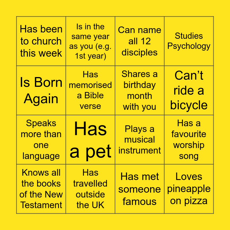 This bingo card has 16 words: Has travelled outside the UK, Has a favourite worship song, Can name all 12 disciples, Has been to church this week, Speaks more than one language, Is in the same year as you (e.g. 1st year), Plays a musical instrument, Has met someone famous, Is Born Again, Has memorised a Bible verse, Knows all the books of the New Testament, Studies Psychology, Has a pet, Can’t ride a bicycle, Shares a birthday month with you and Loves pineapple on pizza.
