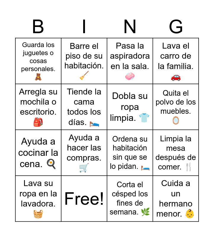 This bingo card has 21 words: Free!, Lava los platos en casa. 🍽️, Barre el piso de su habitación. 🧹, Saca la basura todos los días. 🚮, Corta el césped los fines de semana. 🌿, Dobla su ropa limpia. 👕, Guarda los juguetes o cosas personales. 🧸, Pasa la aspiradora en la sala. 🧼, Ordena su habitación sin que se lo pidan. 🛏️, Quita el polvo de los muebles. 🪞, Ayuda a cocinar la cena. 🍳, Lava el carro de la familia. 🚗, Cuida a un hermano menor. 👶, Saca al perro a caminar. 🐕, Tiende la cama todos los días. 🛌, Riega las plantas o flores. 🌷, Lava su ropa en la lavadora. 🧺, Ayuda a hacer las compras. 🛒, Arregla su mochila o escritorio. 🎒, Limpia la mesa después de comer. 🍴 and Ayuda a un vecino o familiar con una tarea doméstica. 🤝.