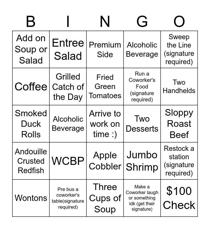This bingo card has a free space and 28 words: Restock a station (signature required), Lunch Feature, Run a Coworker's Food (signature required), Make a Coworker laugh or something idk (get their signature), Coffee, Premium Side, Entree Salad, Andouille Crusted Redfish, Two Desserts, Wontons, Smoked Duck Rolls, Alcoholic Beverage, Pre bus a coworker's table(signature required), Three Cups of Soup, Two Handhelds, Clean a station (signature required), WCBP, Grilled Catch of the Day, Fried Green Tomatoes, Apple Cobbler, Add on Soup or Salad, Two Appetizers, $100 Check, Alcoholic Beverage, Sloppy Roast Beef, Jumbo Shrimp, Sweep the Line (signature required) and Seat a table for the Host (signature required.