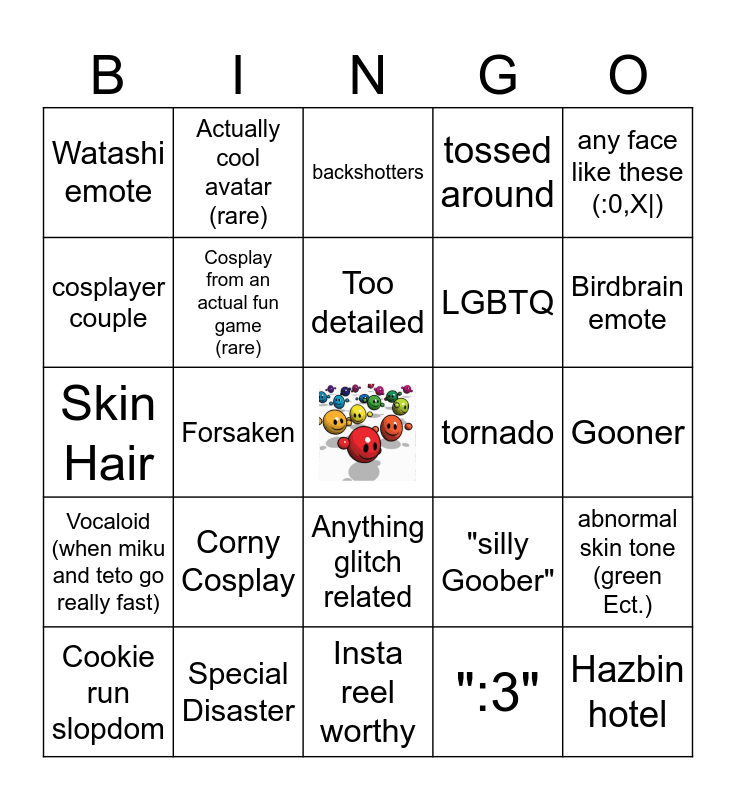 This bingo card has a free space and 24 words: Corny Cosplay, Special Disaster, Too detailed, Cookie run slopdom, any face like these (:0,X|), Watashi emote, cosplayer couple, Actually cool avatar (rare), tornado, Anything glitch related, LGBTQ, Skin Hair, "silly Goober", abnormal skin tone (green Ect.), Cosplay from an actual fun game (rare), ":3", Gooner, backshotters, Birdbrain emote, Forsaken, Hazbin hotel, Vocaloid (when miku and teto go really fast), tossed around and Insta reel worthy.