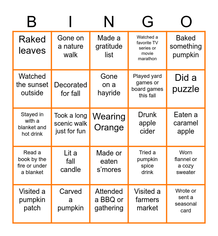 This bingo card has a free space and 24 words: Lit a fall candle, Carved a pumpkin, Gone on a hayride, Visited a pumpkin patch, Baked something pumpkin, Raked leaves, Watched the sunset outside, Gone on a nature walk, Drunk apple cider, Made or eaten s’mores, Played yard games or board games this fall, Stayed in with a blanket and hot drink, Tried a pumpkin spice drink, Worn flannel or a cozy sweater, Decorated for fall, Visited a farmers market, Eaten a caramel apple, Made a gratitude list, Did a puzzle, Took a long scenic walk just for fun, Wrote or sent a seasonal card, Read a book by the fire or under a blanket, Watched a favorite TV series or movie marathon and Attended a BBQ or gathering.