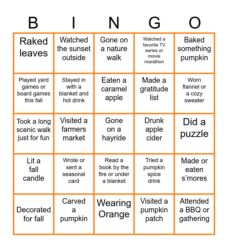 This bingo card has 25 words: Lit a fall candle, Carved a pumpkin, Gone on a hayride, Visited a pumpkin patch, Baked something pumpkin, Raked leaves, Watched the sunset outside, Gone on a nature walk, Drunk apple cider, Made or eaten s’mores, Played yard games or board games this fall, Stayed in with a blanket and hot drink, Wearing Orange, Tried a pumpkin spice drink, Worn flannel or a cozy sweater, Decorated for fall, Visited a farmers market, Eaten a caramel apple, Made a gratitude list, Did a puzzle, Took a long scenic walk just for fun, Wrote or sent a seasonal card, Read a book by the fire or under a blanket, Watched a favorite TV series or movie marathon and Attended a BBQ or gathering.