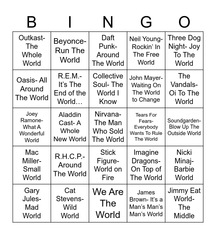 This bingo card has 27 words: Imagine Dragons- On Top of The World, Jimmy Eat World- The Middle, John Mayer- Waiting On The World to Change, We Are The World, Oasis- All Around The World, Daft Punk- Around The World, Beyonce- Run The World, Mac Miller- Small World, Tears For Fears- Everybody Wants To Rule The World, Nicki Minaj- Barbie World, Joey Ramone- What A Wonderful World, Neil Young- Rockin’ In The Free World, Gary Jules- Mad World, Cat Stevens- Wild World, The Vandals- Oi To The World, Kenny Chesney- Bar at the End of the World, R.E.M.- It’s The End of the World…, Collective Soul- The World I Know, R.H.C.P.- Around The World, Outkast- The Whole World, Soundgarden- Blow Up The Outside World, James Brown- It’s a Man’s Man’s Man’s World, Aladdin Cast- A Whole New World, Nirvana- The Man Who Sold The World, Stick Figure- World on Fire, Three Dog Night- Joy To The World and 2 Pac- Me Against The World.