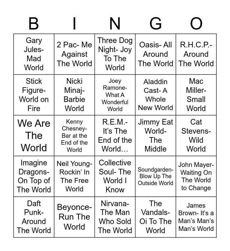 This bingo card has 27 words: Soundgarden- Blow Up The Outside World, James Brown- It’s a Man’s Man’s Man’s World, Aladdin Cast- A Whole New World, Nirvana- The Man Who Sold The World, Stick Figure- World on Fire, Three Dog Night- Joy To The World, 2 Pac- Me Against The World, Imagine Dragons- On Top of The World, Jimmy Eat World- The Middle, John Mayer- Waiting On The World to Change, We Are The World, Oasis- All Around The World, Daft Punk- Around The World, Beyonce- Run The World, Mac Miller- Small World, Tears For Fears- Everybody Wants To Rule The World, Nicki Minaj- Barbie World, Joey Ramone- What A Wonderful World, Neil Young- Rockin’ In The Free World, Gary Jules- Mad World, Cat Stevens- Wild World, The Vandals- Oi To The World, Kenny Chesney- Bar at the End of the World, R.E.M.- It’s The End of the World…, Collective Soul- The World I Know, R.H.C.P.- Around The World and Outkast- The Whole World.
