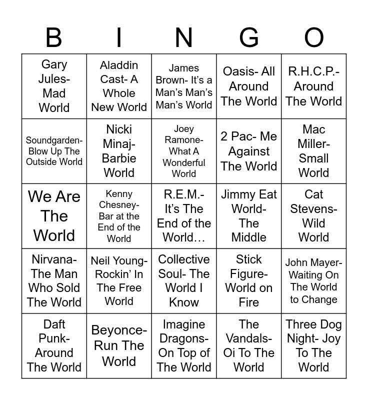 This bingo card has 27 words: Stick Figure- World on Fire, Three Dog Night- Joy To The World, 2 Pac- Me Against The World, Imagine Dragons- On Top of The World, Soundgarden- Blow Up The Outside World, James Brown- It’s a Man’s Man’s Man’s World, Aladdin Cast- A Whole New World, Nirvana- The Man Who Sold The World, Jimmy Eat World- The Middle, John Mayer- Waiting On The World to Change, We Are The World, Oasis- All Around The World, Daft Punk- Around The World, Beyonce- Run The World, Mac Miller- Small World, Tears For Fears- Everybody Wants To Rule The World, Nicki Minaj- Barbie World, Joey Ramone- What A Wonderful World, Neil Young- Rockin’ In The Free World, Gary Jules- Mad World, Cat Stevens- Wild World, The Vandals- Oi To The World, Kenny Chesney- Bar at the End of the World, R.E.M.- It’s The End of the World…, Collective Soul- The World I Know, R.H.C.P.- Around The World and Outkast- The Whole World.