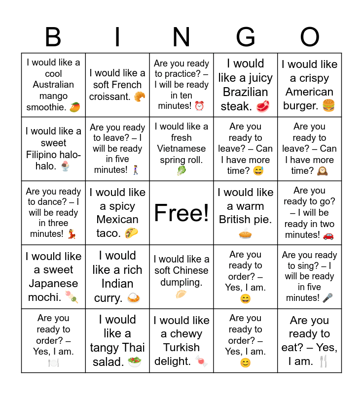 This bingo card has a free space and 33 words: I would like a delicious Korean bibimbap. 🥢, Are you ready to eat? – Yes, I am. 😋, I would like a spicy Mexican taco. 🌮, Are you ready to study? – Can I have more time? ⏳, I would like a sweet Japanese mochi. 🍡, Are you ready to leave? – I will be ready in five minutes! 🚶♀️, I would like a crispy American burger. 🍔, Are you ready to order? – Yes, I am. 🍽️, I would like a soft French croissant. 🥐, Are you ready to go? – Can I have more time? 🙈, I would like a fresh Vietnamese spring roll. 🥬, Are you ready to practice? – I will be ready in ten minutes! ⏰, I would like a creamy Italian pasta. 🍝, Are you ready to play? – Yes, I am. 🎮, I would like a warm British pie. 🥧, Are you ready to leave? – Can I have more time? 🕰️, I would like a tangy Thai salad. 🥗, Are you ready to dance? – I will be ready in three minutes! 💃, I would like a rich Indian curry. 🍛, Are you ready to order? – Yes, I am. 😄, I would like a soft Chinese dumpling. 🥟, Are you ready to study? – Can I have more time? 📚, I would like a cool Australian mango smoothie. 🥭, Are you ready to go? – I will be ready in two minutes! 🚗, I would like a chewy Turkish delight. 🍬, Are you ready to eat? – Yes, I am. 🍴, I would like a juicy Brazilian steak. 🥩, Are you ready to leave? – Can I have more time? 😅, I would like a sweet Filipino halo-halo. 🍨, Are you ready to sing? – I will be ready in five minutes! 🎤, I would like a crispy Malaysian satay. 🍢, Are you ready to order? – Yes, I am. 😊 and I would like a light Greek salad. 🥒.