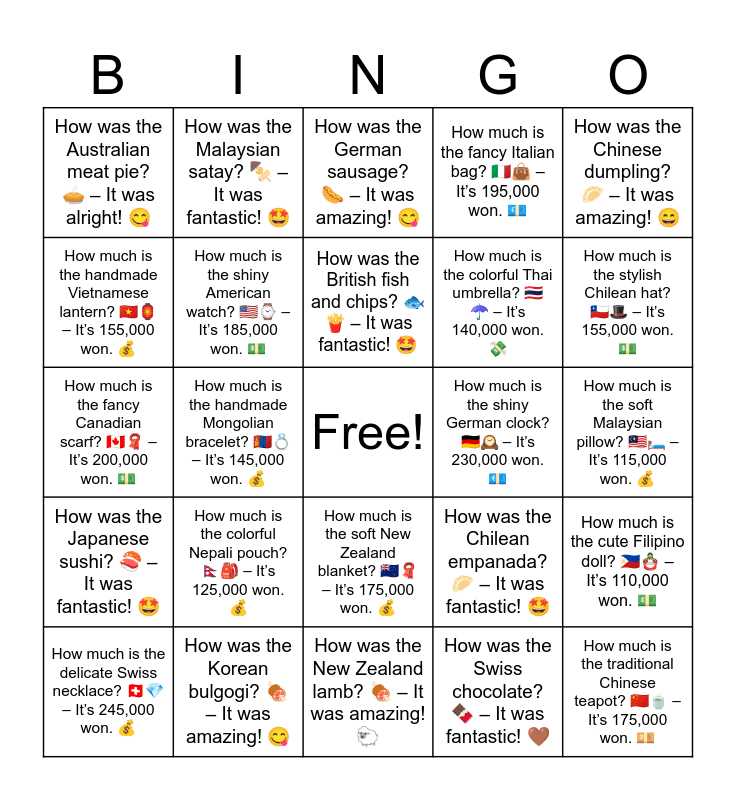 This bingo card has a free space and 62 words: How much is the beautiful Korean fan? ๐ฐ๐ท๐ชญ โ Itโs 120,000 won. ๐ธ, How was the Korean bulgogi? ๐ โ It was amazing! ๐, How much is the cute Japanese keychain? ๐ฏ๐ต๐ โ Itโs 135,000 won. ๐ด, How was the Japanese sushi? ๐ฃ โ It was fantastic! ๐คฉ, How much is the elegant French perfume? ๐ซ๐ท๐ โ Itโs 210,000 won. ๐ฐ, How was the French croissant? ๐ฅ โ It was alright! ๐, How much is the shiny American watch? ๐บ๐ธโ โ Itโs 185,000 won. ๐ต, How was the American burger? ๐ โ It was amazing! ๐, How much is the colorful Thai umbrella? ๐น๐ญโ๏ธ โ Itโs 140,000 won. ๐ธ, How was the Thai curry? ๐ โ It was fantastic! ๐, How much is the fancy Italian bag? ๐ฎ๐น๐ โ Itโs 195,000 won. ๐ถ, How was the Italian pasta? ๐ โ It was amazing! ๐คค, How much is the handmade Vietnamese lantern? ๐ป๐ณ๐ฎ โ Itโs 155,000 won. ๐ฐ, How was the Vietnamese pho? ๐ โ It was fantastic! ๐, How much is the cool Australian hat? ๐ฆ๐บ๐ โ Itโs 125,000 won. ๐ต, How was the Australian meat pie? ๐ฅง โ It was alright! ๐, How much is the traditional Chinese teapot? ๐จ๐ณ๐ต โ Itโs 175,000 won. ๐ด, How was the Chinese dumpling? ๐ฅ โ It was amazing! ๐, How much is the lovely British mug? ๐ฌ๐งโ โ Itโs 160,000 won. ๐ท, How was the British fish and chips? ๐๐ โ It was fantastic! ๐คฉ, How much is the shiny German clock? ๐ฉ๐ช๐ฐ๏ธ โ Itโs 230,000 won. ๐ถ, How was the German sausage? ๐ญ โ It was amazing! ๐, How much is the delicate Swiss necklace? ๐จ๐ญ๐ โ Itโs 245,000 won. ๐ฐ, How was the Swiss chocolate? ๐ซ โ It was fantastic! ๐ค, How much is the colorful Indian scarf? ๐ฎ๐ณ๐งฃ โ Itโs 150,000 won. ๐ธ, How was the Indian curry? ๐ โ It was amazing! ๐ฅ, How much is the beautiful Turkish lamp? ๐น๐ท๐ก โ Itโs 190,000 won. ๐ฐ, How was the Turkish kebab? ๐ข โ It was fantastic! ๐, How much is the cute Filipino doll? ๐ต๐ญ๐ช โ Itโs 110,000 won. ๐ต, How was the Filipino halo-halo? ๐จ โ It was amazing! ๐ฅฐ, How much is the elegant Spanish fan? ๐ช๐ธ๐ชญ โ Itโs 170,000 won. ๐ถ, How was the Spanish paella? ๐ฒ โ It was fantastic! ๐, How much is the colorful Indonesian batik shirt? ๐ฎ๐ฉ๐ โ Itโs 130,000 won. ๐ธ, How was the Indonesian nasi goreng? ๐ โ It was amazing! ๐, How much is the soft Malaysian pillow? ๐ฒ๐พ๐๏ธ โ Itโs 115,000 won. ๐ฐ, How was the Malaysian satay? ๐ข โ It was fantastic! ๐คฉ, How much is the bright Singaporean tote bag? ๐ธ๐ฌ๐ โ Itโs 160,000 won. ๐ต, How was the Singaporean laksa? ๐ โ It was amazing! ๐, How much is the handmade Mongolian bracelet? ๐ฒ๐ณ๐ โ Itโs 145,000 won. ๐ฐ, How was the Mongolian barbecue? ๐ โ It was alright! ๐, How much is the fancy Canadian scarf? ๐จ๐ฆ๐งฃ โ Itโs 200,000 won. ๐ต, How was the Canadian pancake? ๐ฅ โ It was fantastic! ๐, How much is the colorful Nepali pouch? ๐ณ๐ต๐ โ Itโs 125,000 won. ๐ฐ, How was the Nepali momo? ๐ฅ โ It was amazing! ๐, How much is the stylish Chilean hat? ๐จ๐ฑ๐ฉ โ Itโs 155,000 won. ๐ต, How was the Chilean empanada? ๐ฅ โ It was fantastic! ๐คฉ, How much is the traditional Egyptian bracelet? ๐ช๐ฌ๐ โ Itโs 180,000 won. ๐ฐ, How was the Egyptian falafel? ๐ง โ It was amazing! ๐, How much is the detailed Moroccan carpet? ๐ฒ๐ฆ๐งถ โ Itโs 220,000 won. ๐ธ, How was the Moroccan couscous? ๐ฒ โ It was fantastic! ๐, How much is the soft New Zealand blanket? ๐ณ๐ฟ๐งฃ โ Itโs 175,000 won. ๐ฐ, How was the New Zealand lamb? ๐ โ It was amazing! ๐, How much is the unique South African carving? ๐ฟ๐ฆ๐ฟ โ Itโs 205,000 won. ๐ต, How was the South African bobotie? ๐ โ It was fantastic! ๐, How much is the traditional Greek vase? ๐ฌ๐ท๐บ โ Itโs 190,000 won. ๐ถ, How was the Greek salad? ๐ฅ โ It was amazing! ๐, How much is the elegant Polish pottery? ๐ต๐ฑ๐ถ โ Itโs 165,000 won. ๐ธ, How was the Polish pierogi? ๐ฅ โ It was fantastic! ๐, How much is the artistic Argentine painting? ๐ฆ๐ท๐จ โ Itโs 210,000 won. ๐ฐ, How was the Argentine steak? ๐ฅฉ โ It was amazing! ๐, How much is the delicate Austrian music box? ๐ฆ๐น๐ต โ Itโs 240,000 won. ๐ถ and How was the Austrian strudel? ๐ฅง โ It was fantastic! ๐คฉ.