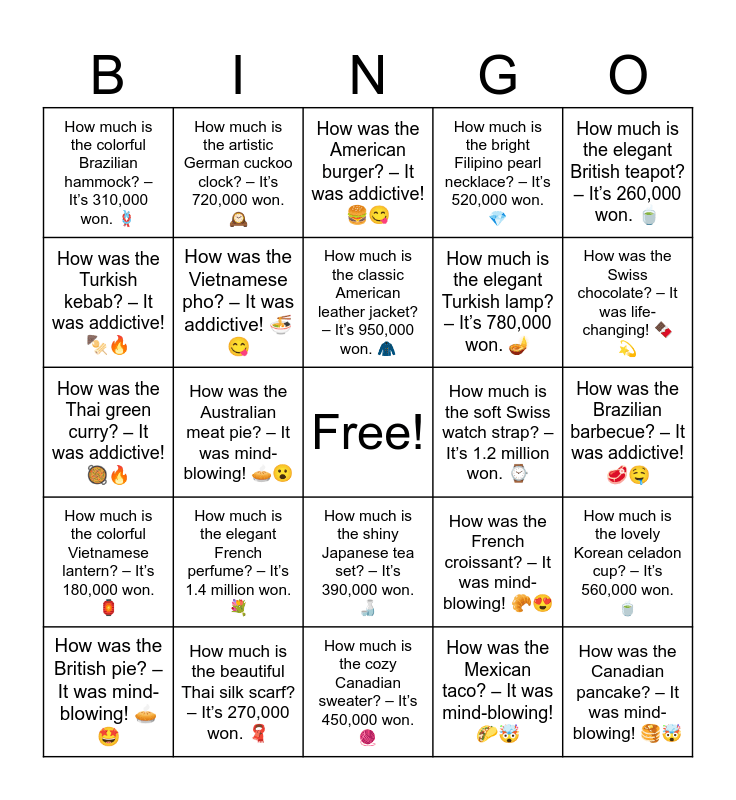 This bingo card has a free space and 34 words: How much is the handmade Mexican bracelet? โ Itโs 220,000 won. ๐, How was the Mexican taco? โ It was mind-blowing! ๐ฎ๐คฏ, How much is the traditional Indian sari? โ Itโs 340,000 won. ๐, How was the Indian curry? โ It was life-changing! ๐โจ, How much is the colorful Vietnamese lantern? โ Itโs 180,000 won. ๐ฎ, How was the Vietnamese pho? โ It was addictive! ๐๐, How much is the elegant British teapot? โ Itโs 260,000 won. ๐ต, How was the British pie? โ It was mind-blowing! ๐ฅง๐คฉ, How much is the artistic German cuckoo clock? โ Itโs 720,000 won. ๐ฐ๏ธ, How was the German pretzel? โ It was life-changing! ๐ฅจ๐, How much is the classic American leather jacket? โ Itโs 950,000 won. ๐งฅ, How was the American burger? โ It was addictive! ๐๐, How much is the delicate Chinese vase? โ Itโs 830,000 won. ๐บ, How was the Chinese dumpling? โ It was mind-blowing! ๐ฅ๐คฏ, How much is the soft Swiss watch strap? โ Itโs 1.2 million won. โ, How was the Swiss chocolate? โ It was life-changing! ๐ซ๐ซ, How much is the beautiful Thai silk scarf? โ Itโs 270,000 won. ๐งฃ, How was the Thai green curry? โ It was addictive! ๐ฅ๐ฅ, How much is the elegant French perfume? โ Itโs 1.4 million won. ๐, How was the French croissant? โ It was mind-blowing! ๐ฅ๐, How much is the shiny Japanese tea set? โ Itโs 390,000 won. ๐ถ, How was the Japanese sushi? โ It was life-changing! ๐ฃ๐, How much is the colorful Brazilian hammock? โ Itโs 310,000 won. ๐ชข, How was the Brazilian barbecue? โ It was addictive! ๐ฅฉ๐คค, How much is the cozy Canadian sweater? โ Itโs 450,000 won. ๐งถ, How was the Canadian pancake? โ It was mind-blowing! ๐ฅ๐คฏ, How much is the bright Filipino pearl necklace? โ Itโs 520,000 won. ๐, How was the Filipino halo-halo? โ It was life-changing! ๐จ๐, How much is the elegant Turkish lamp? โ Itโs 780,000 won. ๐ช, How was the Turkish kebab? โ It was addictive! ๐ข๐ฅ, How much is the modern Australian boomerang art? โ Itโs 640,000 won. ๐จ, How was the Australian meat pie? โ It was mind-blowing! ๐ฅง๐ฎ, How much is the lovely Korean celadon cup? โ Itโs 560,000 won. ๐ต and How was the Korean bibimbap? โ It was life-changing! ๐ฅข๐.