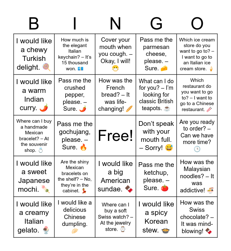 This bingo card has a free space and 34 words: Which restaurant do you want to go to? β I want to go to a Korean restaurant. π, I would like a spicy Korean stew. π², Are you ready to order? β Yes, I am. π, Which snack shop do you want to go to? β I want to go to a Japanese snack shop. π, I would like a sweet Japanese mochi. π‘, Pass me the crushed pepper, please. β Sure. πΆοΈ, Which ice cream store do you want to go to? β I want to go to an Italian ice cream store. π¦, I would like a creamy Italian gelato. π¨, How much is the elegant Italian keychain? β Itβs 15 thousand won. πΆ, Where can I buy a cute French perfume? β At the cosmetics shop. π, How was the French bread? β It was life-changing! π₯, Cover your mouth when you cough. β Okay, I will! π·, Are the colorful Thai fans in the cabinet? β No, theyβre on the shelf. π, What can I do for you? β Iβm looking for bright Thai fans. ποΈ, Donβt speak with your mouth full. β Sorry! π , Which restaurant do you want to go to? β I want to go to a Chinese restaurant. π₯’, I would like a delicious Chinese dumpling. π₯, Where can I buy a handmade Mexican bracelet? β At the souvenir shop. π, Are the shiny Mexican bracelets on the shelf? β No, theyβre in the cabinet. π, Pass me the ketchup, please. β Sure. π , I would like a big American sundae. π«, How much is the cool American cap? β Itβs 25 thousand won. π§’, I would like a chewy Turkish delight. π, Are you ready to order? β Can we have more time? π, Where can I buy a soft Swiss watch? β At the jewelry store. β, How was the Swiss chocolate? β It was mind-blowing! π«, Pass me the parmesan cheese, please. β Sure. π§, Are the elegant British teapots in the drawer? β No, theyβre on the shelf. π΅, What can I do for you? β Iβm looking for classic British teapots. β, I would like a warm Indian curry. πΆοΈ, How much is the pretty Filipino necklace? β Itβs 12 thousand won. π, Pass me the gochujang, please. β Sure. π₯, How was the Malaysian noodles? β It was addictive! π and Where can I buy a lovely Korean fan? β At the traditional shop. π.