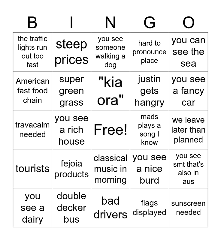 This bingo card has a free space and 24 words: fejoia products, double decker bus, "kia ora", you see a dairy, you can see the sea, the traffic lights run out too fast, American fast food chain, steep prices, mads plays a song I know, classical music in morning, justin gets hangry, travacalm needed, you see a nice burd, you see smt that's also in aus, super green grass, flags displayed, we leave later than planned, you see someone walking a dog, you see a fancy car, you see a rich house, sunscreen needed, tourists, hard to pronounce place and bad drivers.
