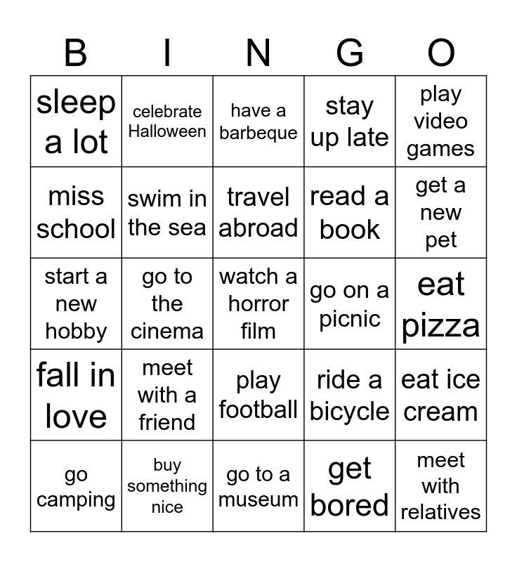 This bingo card has a free space and 24 words: meet with a friend, buy something nice, travel abroad, go camping, play video games, sleep a lot, miss school, celebrate Halloween, go on a picnic, play football, read a book, start a new hobby, ride a bicycle, eat ice cream, swim in the sea, get bored, eat pizza, have a barbeque, get a new pet, go to the cinema, meet with relatives, fall in love, stay up late and go to a museum.