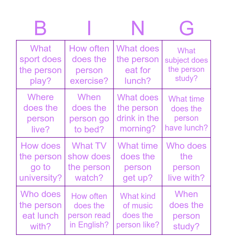 This bingo card has 19 words: What time does the person get up?, Where does the person have breakfast?, What does the person eat for lunch?, When does the person study?, Who does the person live with?, Where does the person live?, What kind of music does the person like?, What sport does the person play?, How often does the person exercise?, How does the person go to university?, What TV show does the person watch?, When does the person go to bed?, What does the person drink in the morning?, How often does the person read in English?, Who does the person eat lunch with?, What does the person do on weekends?, What subject does the person study?, What time does the person have lunch? and Where does the person usually study?.