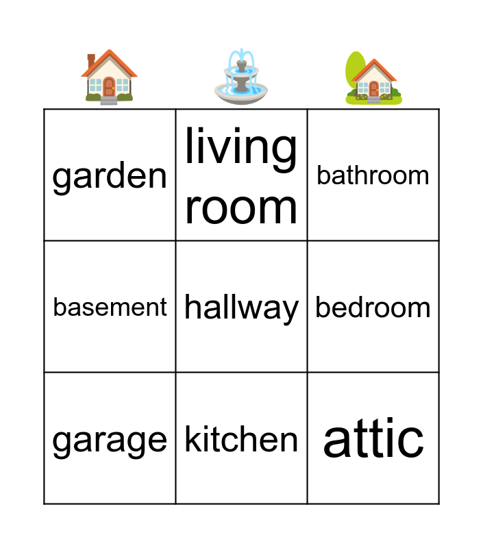 This bingo card has a free space and 8 words: bedroom, bathroom, living room, garage, garden, attic, basement and kitchen.
