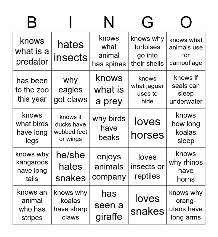 This bingo card has 25 words: he/she hates snakes, has seen a giraffe, knows what is a prey, knows an animal who has stripes, knows what animals use for camouflage, knows what is a predator, has been to the zoo this year, hates insects, loves horses, enjoys animals company, knows what jaguar uses to hide, knows what birds have long legs, loves insects or reptiles, knows why rhinos have horns, why eagles got claws, knows why orang-utans have long arms, knows how long koalas sleep, knows what animal has spines, knows if seals can sleep underwater, knows if ducks have webbed feet or wings, why birds have beaks, knows why koalas have sharp claws, knows why kangaroos have long tails, knows why tortoises go into their shells and loves snakes.