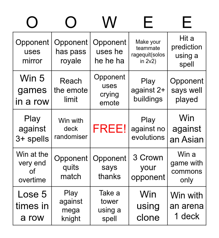 This bingo card has a free space and 24 words: Opponent quits match, Play against mega knight, Opponent uses crying emote, Lose 5 times in a row, Hit a prediction using a spell, Opponent uses mirror, Win 5 games in a row, Opponent has pass royale, Play against no evolutions, Opponent says thanks, Play against 2+ buildings, Play against 3+ spells, 3 Crown your opponent, Win a game with commons only, Reach the emote limit, Win using clone, Win against an Asian, Opponent uses he he he ha, Opponent says well played, Win with deck randomiser, Win with an arena 1 deck, Win at the very end of overtime, Make your teammate ragequit(solos in 2v2) and Take a tower using a spell.