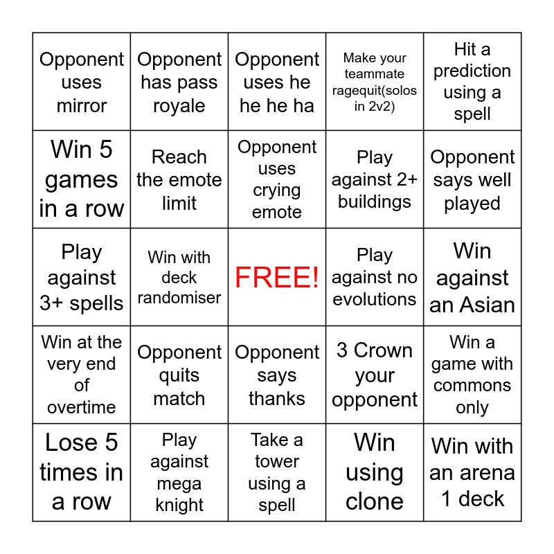 This bingo card has a free space and 24 words: Opponent quits match, Play against mega knight, Opponent uses crying emote, Lose 5 times in a row, Hit a prediction using a spell, Opponent uses mirror, Win 5 games in a row, Opponent has pass royale, Play against no evolutions, Opponent says thanks, Play against 2+ buildings, Play against 3+ spells, 3 Crown your opponent, Win a game with commons only, Reach the emote limit, Win using clone, Win against an Asian, Opponent uses he he he ha, Opponent says well played, Win with deck randomiser, Win with an arena 1 deck, Win at the very end of overtime, Make your teammate ragequit(solos in 2v2) and Take a tower using a spell.