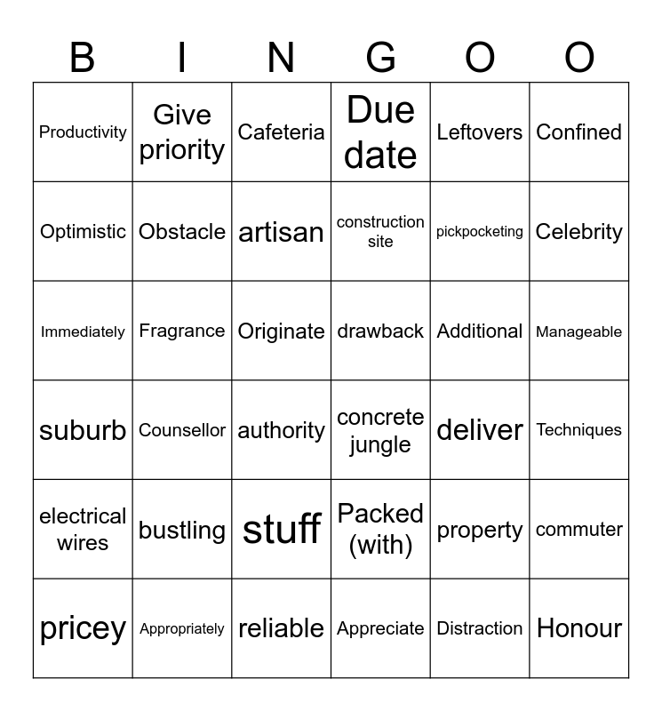 This bingo card has 36 words: Packed (with), stuff, Appreciate, Optimistic, suburb, drawback, Obstacle, reliable, Leftovers, property, Celebrity, Due date, commuter, Fragrance, construction site, Productivity, electrical wires, Additional, Immediately, Cafeteria, Originate, Counsellor, concrete jungle, authority, deliver, Give priority, pickpocketing, Appropriately, artisan, Confined, Honour, pricey, Techniques, Manageable, bustling and Distraction.