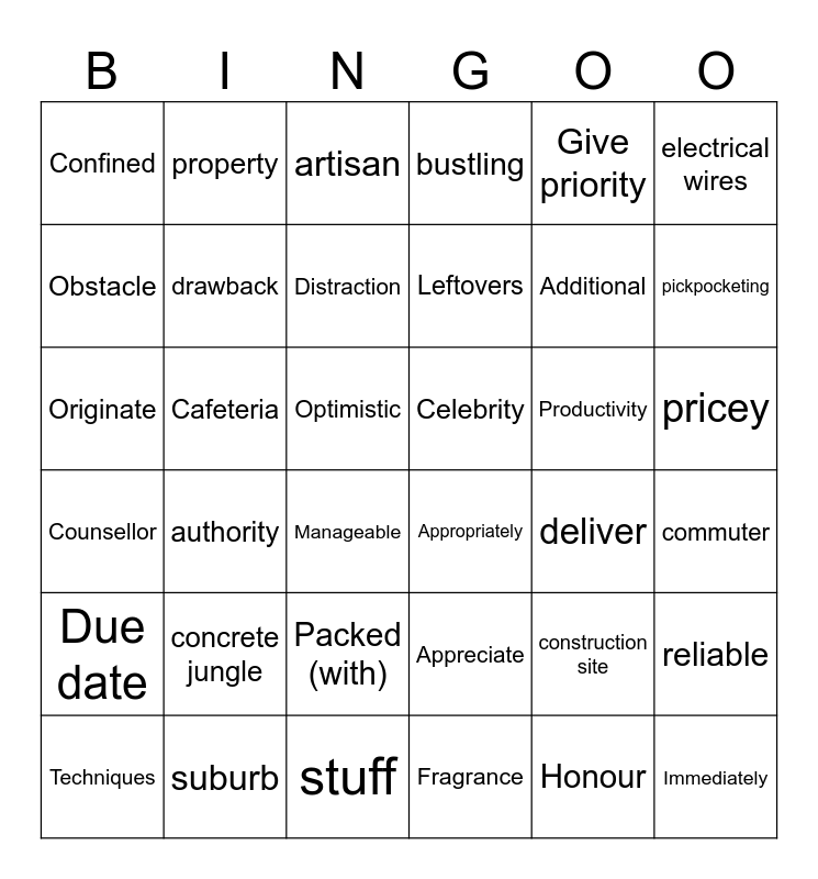 This bingo card has 36 words: Appreciate, Packed (with), Fragrance, Obstacle, Counsellor, Celebrity, drawback, stuff, Give priority, construction site, pickpocketing, bustling, reliable, Cafeteria, Leftovers, Confined, Due date, Productivity, Originate, artisan, Optimistic, authority, Appropriately, Manageable, deliver, property, Additional, suburb, Distraction, electrical wires, Immediately, Techniques, commuter, pricey, concrete jungle and Honour.