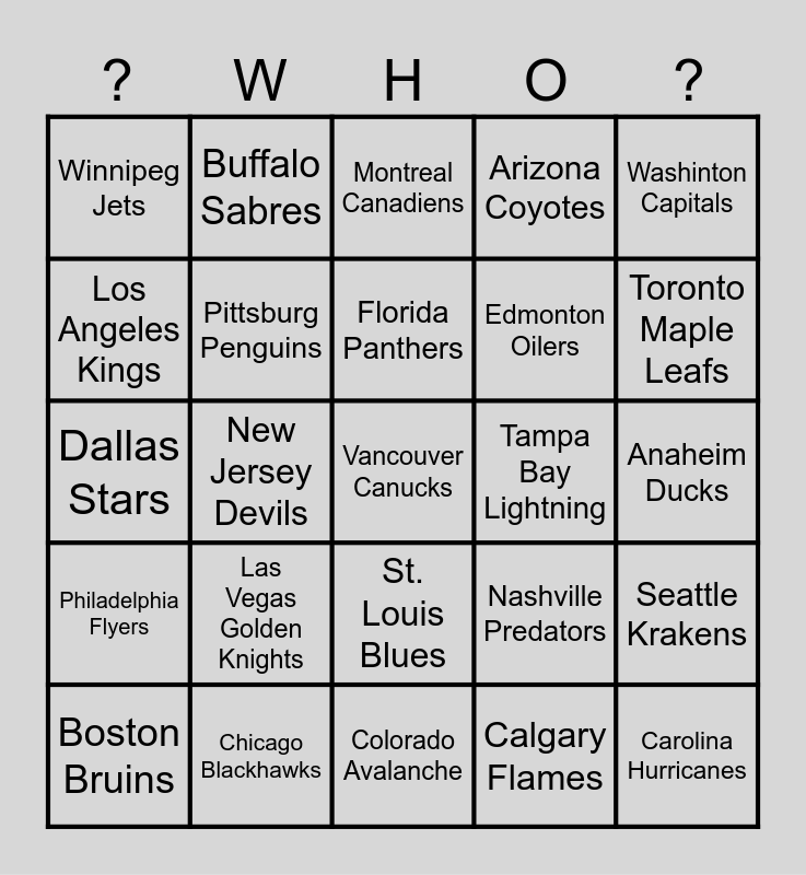 This bingo card has 33 words: Carolina Hurricanes, Columbus Blue Jackets, New Jersey Devils, New York Islanders, Philadelphia Flyers, Pittsburg Penguins, Washinton Capitals, Boston Bruins, Buffalo Sabres, Detroit Red Wings, Florida Panthers, Montreal Canadiens, San Jose Sharks, Ottawa Senators, Tampa Bay Lightning, Toronto Maple Leafs, Chicago Blackhawks, Dallas Stars, Las Vegas Golden Knights, Nashville Predators, St. Louis Blues, Utah Mammoths, Winnipeg Jets, Anaheim Ducks, Colorado Avalanche, Vancouver Canucks, Arizona Coyotes, Edmonton Oilers, Los Angeles Kings, Seattle Krakens, Minnesota Wila, Calgary Flames and New Jersey Devils (OLD).