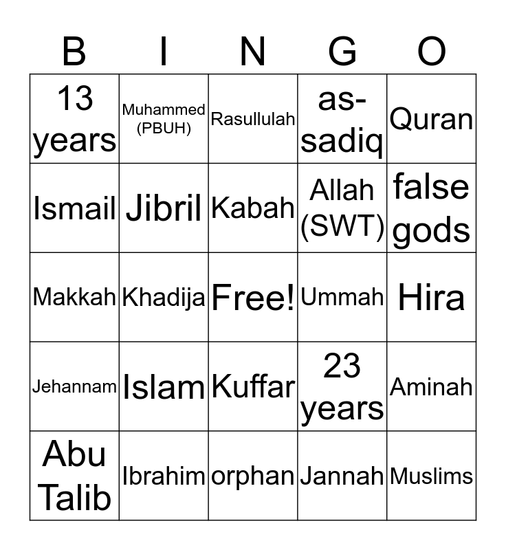This bingo card has a free space and 24 words: Islam, Ibrahim, Kabah, Abu Talib, Quran, 13 years, Ismail, Muhammed (PBUH), Ummah, Kuffar, Allah (SWT), Makkah, 23 years, Aminah, Jibril, Jannah, Hira, Rasullulah, false gods, Khadija, Muslims, Jehannam, as-sadiq and orphan.