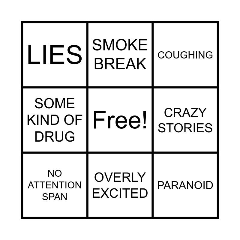 This bingo card has a free space and 9 words: NO ATTENTION SPAN, COUGHING, SMOKE BREAK, SOME KIND OF DRUG, LIES, CRAZY STORIES, PARANOID, WHAT THE F and OVERLY EXCITED.