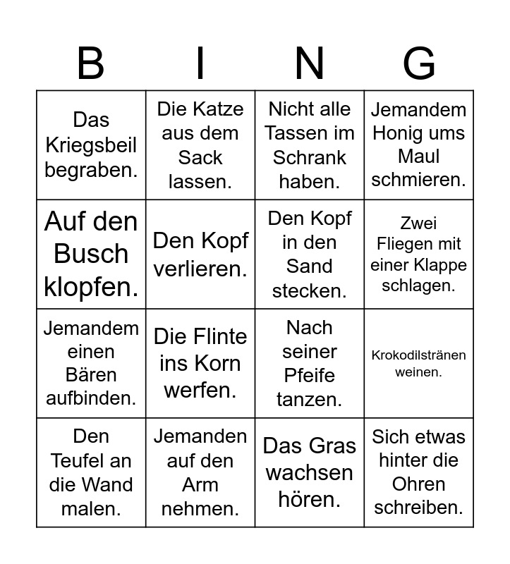This bingo card has 21 words: Jemanden auf den Arm nehmen., Mit dem Kopf durch die Wand wollen., Die Katze aus dem Sack lassen., Lange Finger machen., Das Gras wachsen hören., Den Kopf in den Sand stecken., Das Kriegsbeil begraben., Nicht alle Tassen im Schrank haben., Nach seiner Pfeife tanzen., Zwei Fliegen mit einer Klappe schlagen., Jemandem einen Bären aufbinden., Jemandem Honig ums Maul schmieren., Sich etwas hinter die Ohren schreiben., In der Tinte sitzen., Den Kopf verlieren., Jemanden an der Nase herumführen., Den Teufel an die Wand malen., Die Flinte ins Korn werfen., Auf den Busch klopfen., Krokodilstränen weinen. and Jemandem platzt der Kragen..