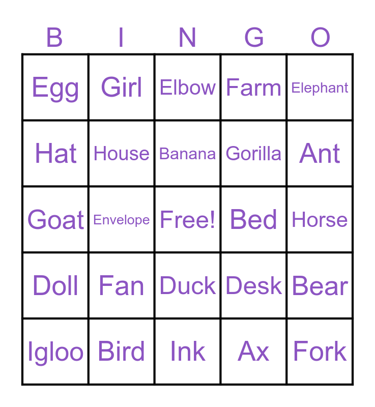 This bingo card has a free space and 32 words: Igloo, Iguana, Ink, insect, Horse, Hat, House, Hot dog, Gorilla, Gift, Goat, Girl, Apple, Ax, Ant, Alligator, Bird, Banana, Bed, Bear, Doll, Dog, Duck, Desk, Elephant, Egg, Envelope, Elbow, Farm, Fork, Fish and Fan.