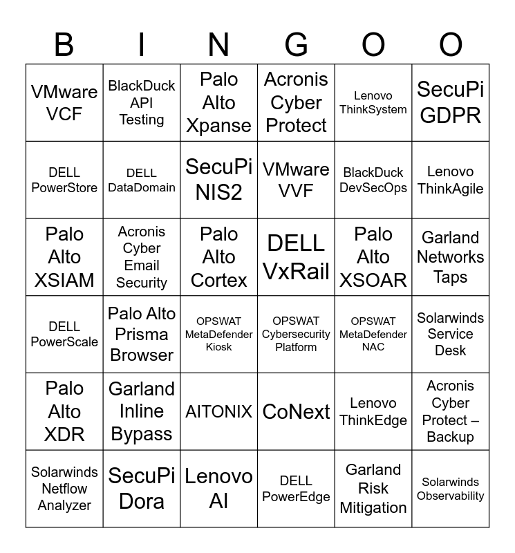 This bingo card has 36 words: CoNext, AITONIX, DELL PowerEdge, DELL PowerStore, DELL PowerScale, DELL VxRail, DELL DataDomain, Lenovo AI, Lenovo ThinkSystem, Lenovo ThinkEdge, Lenovo ThinkAgile, Acronis Cyber Protect, Acronis Cyber Protect – Backup, Acronis Cyber Email Security, VMware VVF, VMware VCF, Palo Alto XDR, Palo Alto XSOAR, Palo Alto XSIAM, Palo Alto Xpanse, Palo Alto Cortex, Palo Alto Prisma Browser, OPSWAT Cybersecurity Platform, OPSWAT MetaDefender Kiosk, OPSWAT MetaDefender NAC, BlackDuck API Testing, BlackDuck DevSecOps, SecuPi Dora, SecuPi NIS2, SecuPi GDPR, Solarwinds Observability, Solarwinds Netflow Analyzer, Solarwinds Service Desk, Garland Networks Taps, Garland Inline Bypass and Garland Risk Mitigation.