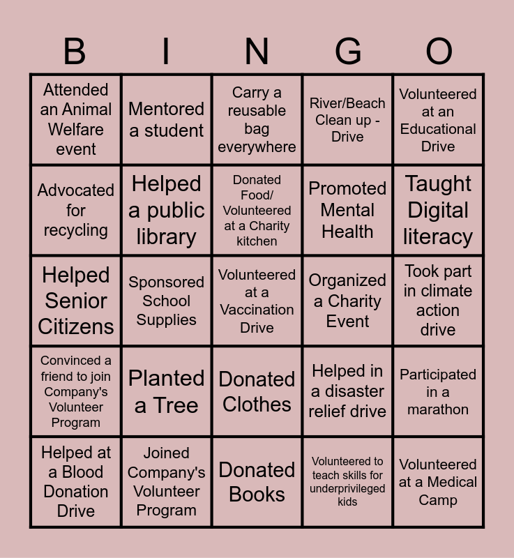 This bingo card has 25 words: Planted a Tree, Donated Books, Donated Food/ Volunteered at a Charity kitchen, Helped at a Blood Donation Drive, Volunteered at an Educational Drive, Attended an Animal Welfare event, Advocated for recycling, Mentored a student, Organized a Charity Event, Donated Clothes, Promoted Mental Health, Helped Senior Citizens, Helped in a disaster relief drive, Participated in a marathon, Helped a public library, Volunteered at a Medical Camp, Took part in climate action drive, Carry a reusable bag everywhere, Taught Digital literacy, Sponsored School Supplies, Volunteered at a Vaccination Drive, Joined Company's Volunteer Program, Convinced a friend to join Company's Volunteer Program, River/Beach Clean up - Drive and Volunteered to teach skills for underprivileged kids.
