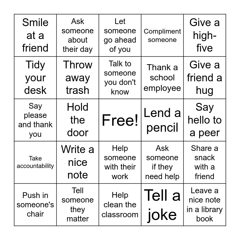 This bingo card has a free space and 24 words: Write a nice note, Tell someone they matter, Talk to someone you don't know, Push in someone's chair, Give a high-five, Smile at a friend, Tidy your desk, Ask someone about their day, Lend a pencil, Help someone with their work, Thank a school employee, Say please and thank you, Ask someone if they need help, Share a snack with a friend, Throw away trash, Tell a joke, Say hello to a peer, Let someone go ahead of you, Give a friend a hug, Hold the door, Leave a nice note in a library book, Take accountability, Compliment someone and Help clean the classroom.