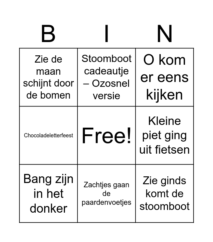 This bingo card has a free space and 15 words: De pieten sinterklaas move, Pietenliefde, O kom er eens kijken, Zie de maan schijnt door de bomen, Zachtjes gaan de paardenvoetjes, Zie ginds komt de stoomboot, Sinterklaas kapoentje, Daar wordt aan de deur geklopt, Kleine piet ging uit fietsen, Rommel de bommel, De zak van Sinterklaas, Chocoladeletterfeest, Bang zijn in het donker, Stoomboot cadeautje – Ozosnel versie and Sinterklaas wie kent hem niet.