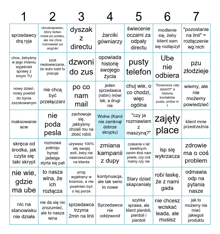 This bingo card has a free space and 48 words: Stary dziad skapceniały, Ube nie odbiera, Sprzedawca nie oddzwonił, nie poda pesla, po co nam mail, klient mnie przedrzeźnia, obcokrajowiec, który ledwo mówi po polsku, ale nie chce rozmawiać po ang/ukr, nie da się nic zrozumieć, ale to nasza wina, modlenie się, żeby klient sam się rozłączył, zmiana kampanii z dupy, "pozostanie na linii" = rozłączenie wg nich, żarciki gówniarzy, "Dzwonicie cały dzień!!!" a historia kontaktów pusta, próba nr 1, chuj wie, o co chodzi, więc ogólna, nie wie, gdzie ma ube, zajęty place, chce, żebyśmy w jego imieniu wyjaśniali sprawy z innym TU, pzu złodzieje, robi łaskę, że z nami gada, świecenie oczami za odpały directu, pusty telefon, zachowuje się, jakbyśmy chcieli mu na złość robić, sprzedawcy drą ryja, szok niedowierzanie, że dużo ludzi tu pracuje, odmawia odp na pytania nasze, dzwoni do zus, wiemy, ale nie możemy powiedzieć, nic na stanowisku nie działa, jeden sprzedawca (rabin) mówi tak, a drugi nie, nie chcą być przełączani, nie chcesz wciskać leada, ale musisz, "czy ja rozmawiam z maszyną?", zdrowie ma o coś problem, to nasza wina, że ich rozłącza, maksowanie acw, czekanie x lat świetlnych, zanim ktoś nam powie, czy coś mamy czy nie, lsp się wykrzacza, nowy dzień, nowy powód do bycia zszokowanym, używasz 100% siły swojej woli, żeby nie nawrzeszczeć na klienta, prog wyjebany w kosmos, a nie powinien być o tej porze, skręca od środka, jak czyta się taki skrypt, jak to możemy nie mieć jakiegoś produktu, dyszak z directu, sprzedawca trzyma 2min na linii, opowiada historię swojego życia, kontynuacja, ale tak serio to nowe, rozmowa pokroju hymel jadwiga styrta się pali and szybka sprawa, ale klient pierdoli, pierdoli i pierdoli.